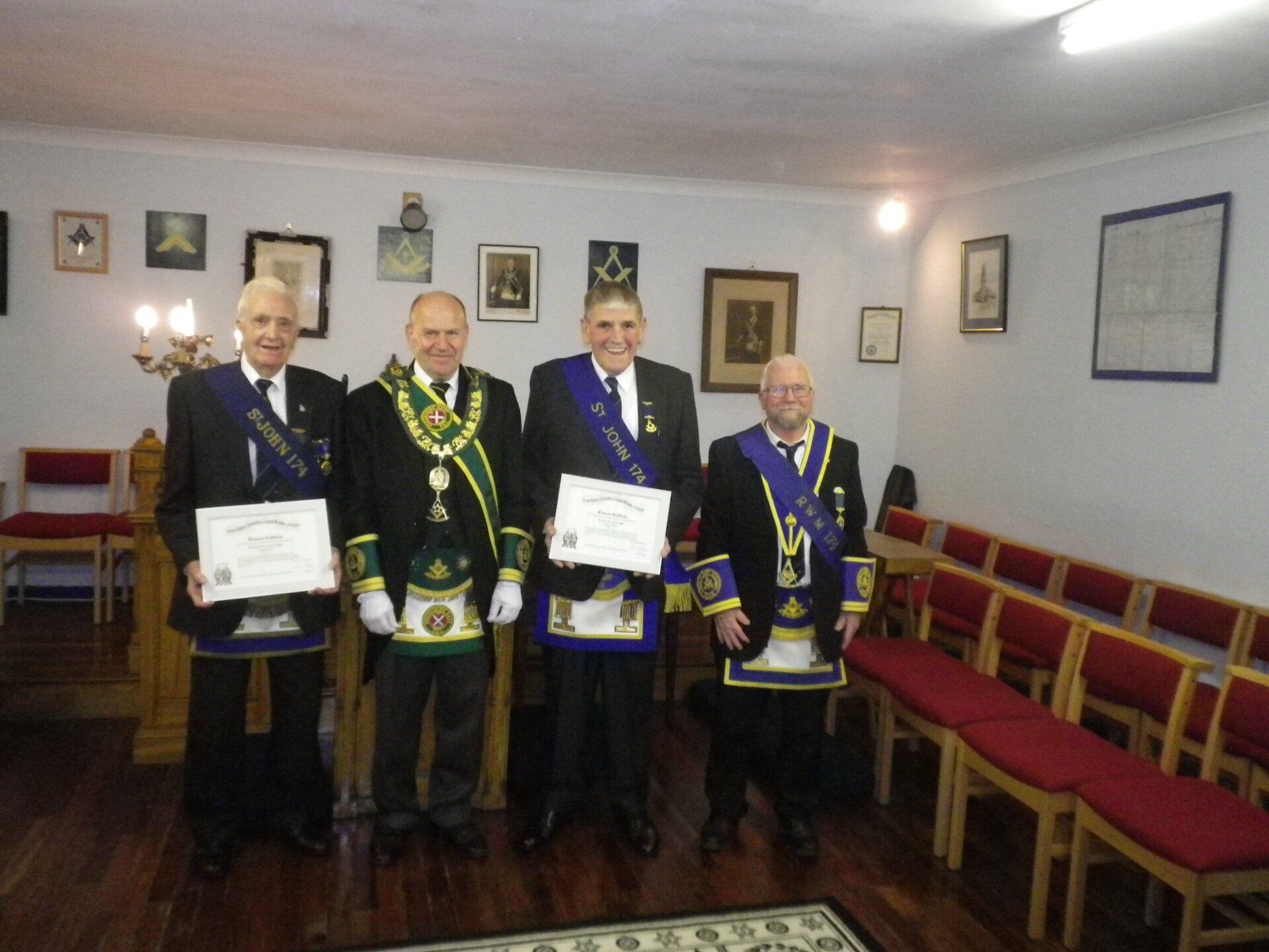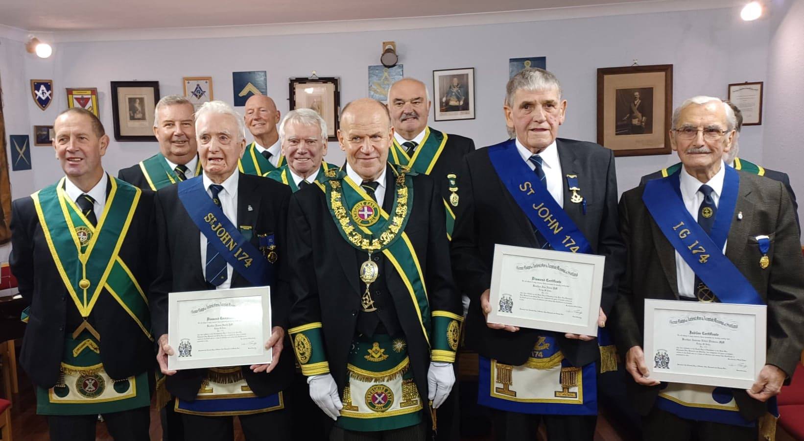 Presentations of Two 60 and one 50 year Certificates to Brothers Jimmy Smith PM PPGLSW, Ian Nairn PM, Andrew Dickson by Ian Cameron Provincial grand Master of Perthshire East and Office Bearers.